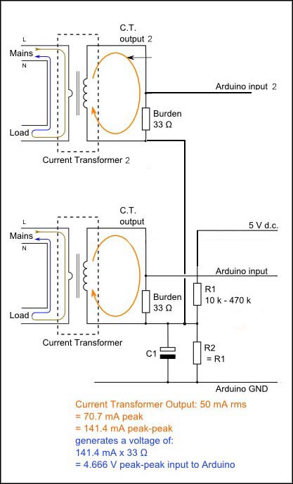 Input cct diagram for C.T. sensors to Arduino Mega